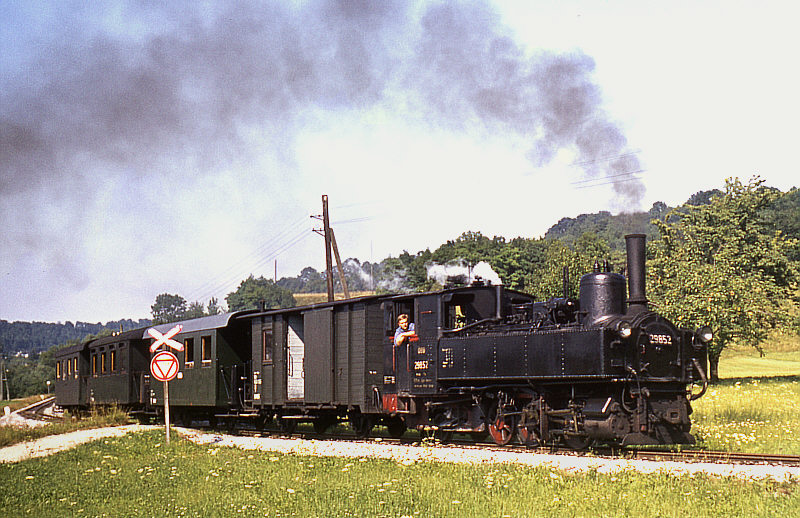 Neben etlichen privat geführten Schmalspurbahnen betrieben auch die Statsbahnen einige Linien auf enger Spur. So auch die Steyrtalbahn zwischen Garsten an der Enns und Klaus an der Pyhrnbahn. Die Trasse glänzte mit vielen romantischen Abschnitten. Hier die 298.52 mit dem GK 31 bei Neuzeug unweit der alten Stadt Steyr. |