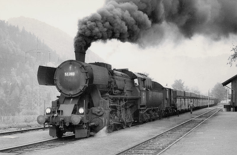 Umweltverschmutzung pur, aber was kümmerte das die Dampflokfreunde in jenen Zeiten, als man hinter den schwarzen Rössern herhechelte. Hauptsache eine kräftige Rauchwolke wie bei der 52.2813 (1944), damit das Motiv auch stimmt. Der fotogene Dampfzug wurde am Mai 1970 im Bf. Windischgarsten an der Pyhrnbahn festgehalten. |
