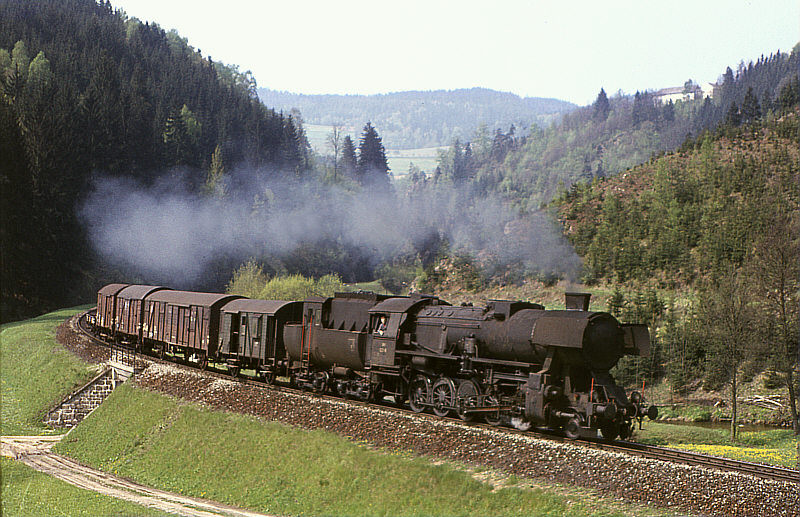 Wir sind im Mühlviertel, einem dünn besiedelten Gebiet nördlich von Liniz. Die Reichsbahn-Kriegslok 52 3816 (Baujahr 1944) mit ÖBB-Kabinentender ist mit dem LS 1010 auf der Summerauer Linie (Linz - Budweis) unterwegs. Am 3. Mai 1975 fand der Fotograf die tolle Fotostelle nahe bei der Ansiedlung Selker. |