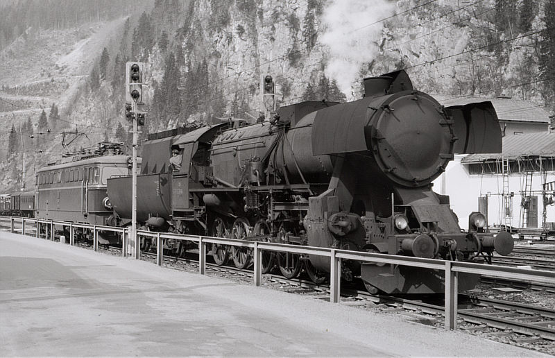Mit vereinten Kräften geht es besser, was bei den schweren Erzzügen oft nötig war. Die “Kriegslokomotive” 52.6966 (Bj. 1943) muss heute als Vorspannlok der (damals natürlich noch grünen) 1042.53 aus dem Jahre 1966 zum Einsatz kommen. Anfang der 70er Jahre wird die Dampflok im Streckendienst bald ausgedient haben (Hieflau Pbf., April 1971). |