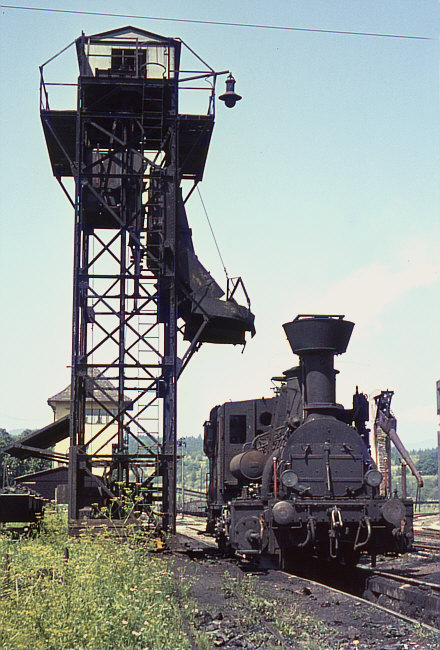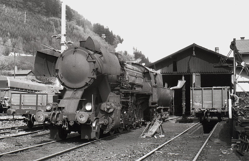 Im Bahnhof von Eisenerz - welch ein technisch-nüchterner, aber zutreffender Name für diesen Ort - gab es eine kleine Lokstation. In erster Linie wichtig für die Loks, die von der nahen Verladestelle Krumpenthal die Erzzüge abholen mussten Die 52.836 von 1944 muss am Lokschuppen von Eisenerz ihre Vorräte auffrischen (so im Mai 1970). |