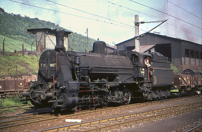 Alte Lok in alter Industrieregion - so könnte man das Bild benennen. Die frühere BBÖ-Baureihe 80.900 wurde zwischen 1909 und 1922 gebaut. Bei der Reichsbahn wurde die sichtbare Maschine als 57 303 eingereiht und bei den ÖBB so weiter geführt. Am Aufnahemort Leoben-Donawitz besteht schon lange ein grosses Stahlwerk (3. August 1966). |