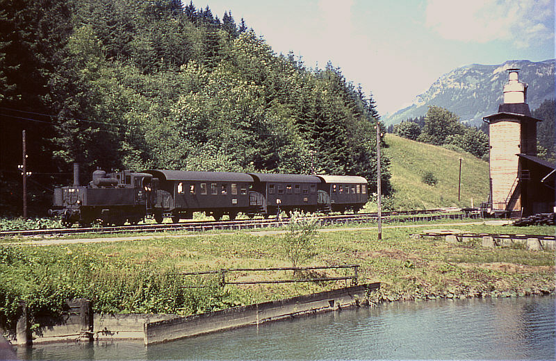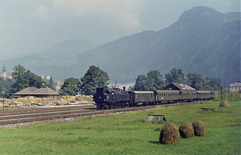 Solch ein schönes Motiv konnte man am 5. August 1965 im oberen Mürztal an der Nebenstrecke von Mürzzuschlag nach Neuberg einfangen. Wir stehen bei der Haltestelle Kohleben, nur wenige Kilometer von der Bezirksstadt am Beginn der Semmering-Südrampe entfernt. Die 91 107 wurde noch zu kaiserlichen Zeiten um die Jahrhundertwende gebaut und bei den kkStB und den BBÖ als Baureihe 99 geführt. |