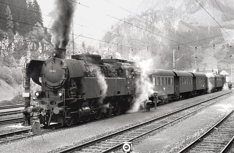 Personenverkehr anno 1970 im Gesäuse! Mit der Dampflok und den alten zweiachsigen Personenwagen der “Spantenbauart” mussten sich die Fahrgäste zufrieden geben. Bald geht es los, am 18. Mai 1970, mit der 78.613 (Baujahr 1936) und dem Zug 2427 aus dem Personenbahnhof von Hieflau auf die Strecke hinaus. |