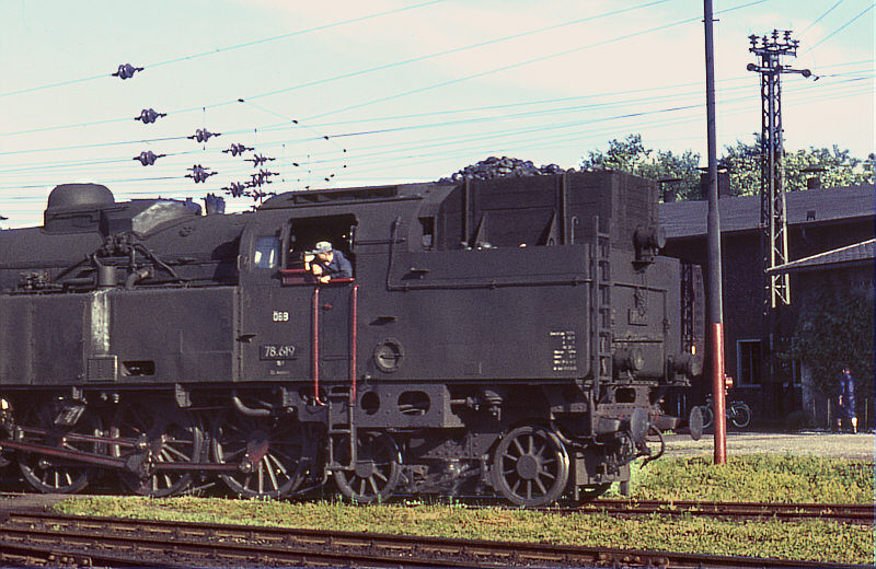 Die Baureihe 78 der ÖBB war als robuste Maschine in der Dampflokzeit noch auf vielen Strecken meist im Personenzugdienst anzutreffen. Hier ein Besuch in der Zugförderung Amstetten, einem wichtigen Knoten an der Westbahn. Bei der 78 619 handelt es sich um einen Fertigbau der BBÖ-Reihe 729 von 1938 (4. August 1967). |