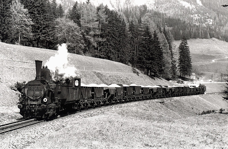 Typischer Frachtenverkehr am Erzberg in alten Dampflokzeiten. Die beladenen Wagen verschiedener Bauarten bringt die 97 209 (Baujahr 1893) zur südlichen Verladestelle. Trotz der Kürze des Zuges ist eine weitere Maschine zu sehen. Wir befinden uns unweit der kleinen Station Glaslbremse (Bremse im Bergbau eine Art Rutsche mit Hemmvorrichtung). |