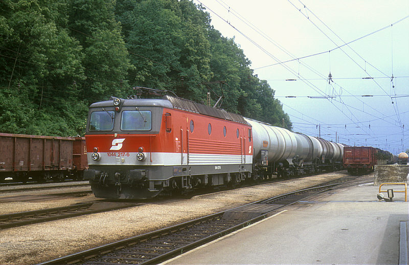 Lambach ist ein Abzweigbahnhof an der Westbahn (Wien - Salzburg). Wir sind am 10. Juni 1992 auf Fototour und bewundern die 1044 217 mit ihrem Kesselzug. Die Baureihe 1044 besitzt mittlerweile viele Detail-/Farbunterarten. |