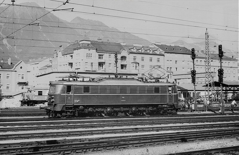 Die Herkunft der 1118.01 ist unverkennbar, denn Grundlage ist die deutsche E 18 von 1938. Ein paar Maschinen verblieben nach dem Krieg in der Alpenrepublik. Am 30. September 1975 fuhr die formschöne Maschine durch den Innsbrucker Westbahnhof. |