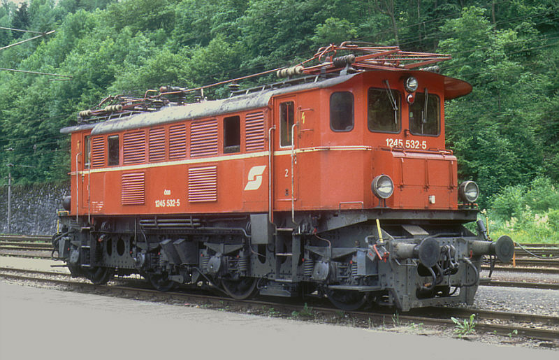 Ab den 70er Jahren änderte sich bei vielen elektrischen Lokomotiven die Farbgebung. Obwohl ein Vorkriegsmodell (1939), sieht die 1245.532 (Zfst. Selzthal) durch das orange Outfit irgendwie “moderner” aus. Wir sind am 11. Juni 1992 in die österreichischen Alpen gefahren, diesmal zum Verschiebebahnhof von Hieflau. |