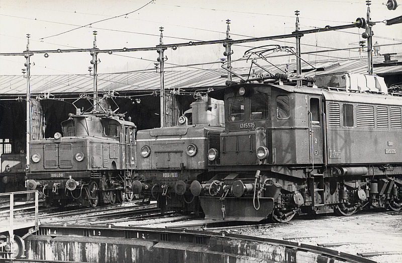 Die Tiroler Landeshauptstadt war schon immer ein wichtiger Bahnknotenpunkt. Entsprechend waren die Depotanlagen ausgestattet, die man von der Olympiabrücke immer gut beobachten konnte. Mit den 1245.535 (Bj. 1940), 1061.03 (1926) sowie 1161.06 (1931) finden wir eine interessante Ansammlung von Altbau-Elloks (Zfl. Innsbruck, April 1973). |