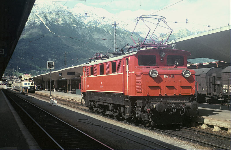 Die Baureihe 1670 (Nr. 06 von 1928) war früher ein typisches Kind auf den Linien des Inntals und zum Brenner hinauf. Oft wurden sie mit einer anderen Ellok zusammen eingesetzt. Hier ein Umsetzmanöver im grossen Hauptbahnhof von Innsbruck mit dem bekannten Blick zur Nordkette. Im Hintergrund steht ein Regional-Tw der Reihe 4030 (Mai 1978). |