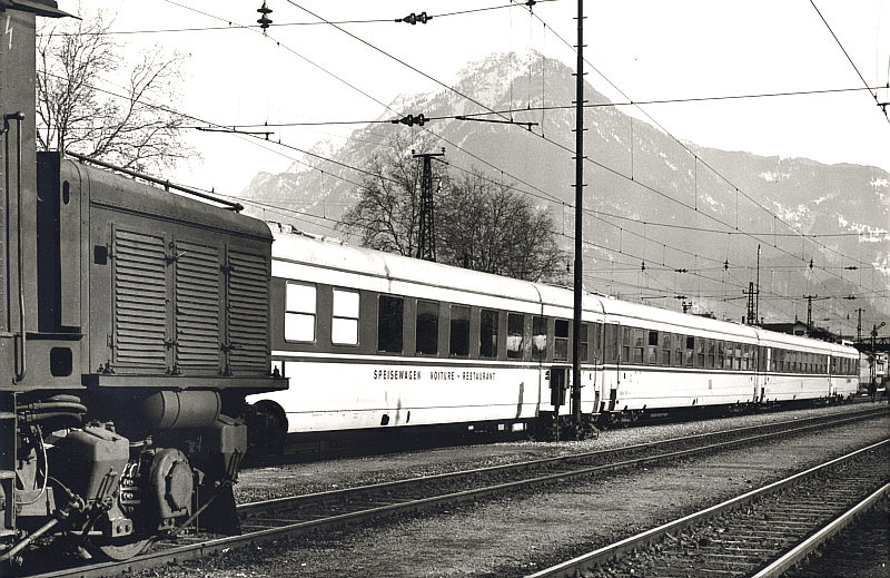 Fast sieht es so aus, als wollte sich die alte Dame der Riege 1020 dezent verstecken ob des schnittigen Triebzuges, als dieser samt “Eigenversorgung” (= Speisewagen) vorbei huscht. Die Züge der Reihe 4010 gehörten auf bestimmten Strecken lange Jahre zum Top-Angebot der ÖBB. Das Bild stammt vom Bf. Bludenz am Fuß der Arlberg-Westrampe, natürlich vor Umbau der heute sichtbaren Bahnhofsanlagen (Anfang der 70er Jahre). Der markante Berg heißt Davenna. |