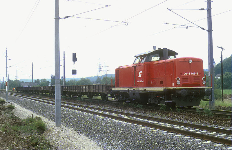 Von der Baureihe V 100 der DB sind nach Abstellung viele Maschinen an andere Bahngesellschaften verkauft wurden. Vielfach werden sie im Baudienst verwendet. Einige Exemplare gelangten auch zu den ÖBB. Hier sehen wir die 2048 012 (ex DB 211 211) mit einem Bauzug in der Nähe vom grossen Bahnknoten Attnang-Puchheim (Juni 1992). |