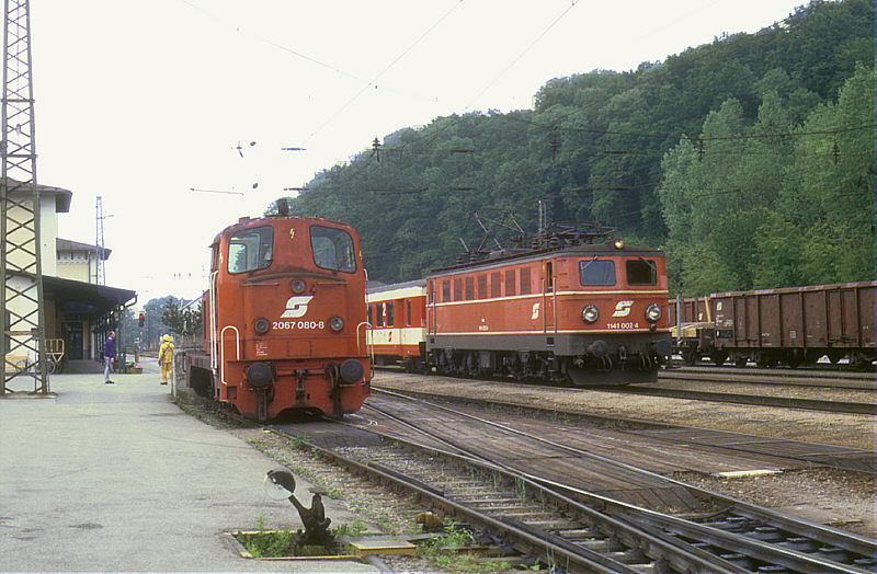 Nochmals ein Abstecher zum Bahnhof von Lambach. Während 2067 080 (Bj. 1974) auf neue Rangiereinsätze wartet, kommt die 1141 002 mit dem Regionalzug 3021 daher (10. Juni 1992). Die Baureihen 1041/1141 sind typische Vertreterinnen einer eher nüchternen Nachkriegs-Generation. Die Nr. 002 erblickte 1955 das Licht der Bahnwelt. |
