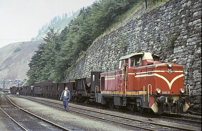 Die 2085.01, Einzelexemplar mit Baujahr 1961, war ein Versuch, mit der Dieseltraktion den aufwändigen Dampflokbetrieb am Erzberg zu ersetzen. Die Zeit hat aber auch die Versuche etwas überholt, denn ein späterer Reibungsbetrieb mit den 2043ern wurde dann doch sehr eingeschränkt eingeführt gegenüber den Dampflok-Zeiten (Bf. Erzberg, 1.8.1968). |