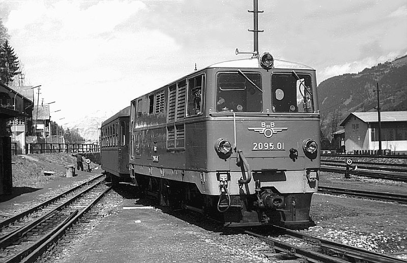 Zur Rationaliserung des Verkehrs kamen auf den ÖBB-Schmalspurstrecken auch einige Dieselfahrzeuge zum Einsatz. Die Reihe 2095 wurde zwischen 1958 und 1962 in einer Serie von 15 Exemplaren gebaut. Die 2095.01 war so etwas wie ein Prototyp und wurde 1958 in Dienst gestellt. Hier rangiert sie einen Personenzug in Zell am See (April 1972). |