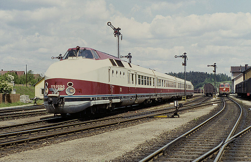 Der VT 18 der Deutschen Reichsbahn (ab 1970 Reihe 175) sollte so etwas wie ein Gegenstück zum VT 11 der DB sein, konnte das aber in keiner Weise erfüllen und fuhr eher in bescheidenem Tempo durch die Landen. Zeitweise war er als Expresszug TS 55 “Vindobona” auf der Linie Berlin - Dresden - Prag - Wien eingesetzt. In Österreich ging es auf kurvenreicher Trasse durchs Waldviertel. In Schwarzenau konnte der Zug am 4. Juni 1975 abgelichtet werden. |