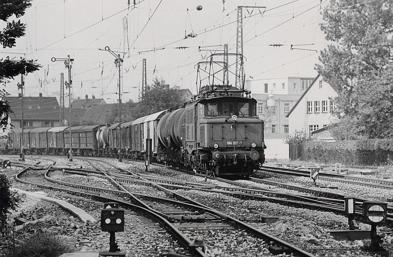 Zum Glück wurde nur eine Altbauellok der Reihe E 94 mit der neuen ozeanblau-beigen Lackierung verunstaltet. Nicht nur, dass die Farbgebung bei den meisten Bahnliebhabern wenig Anklang fand und im Vergleich zum fotogenen Rot, Blau und Grün eine etwas fragwürdige Farbkombination war, auch sahen die meisten Fahrzeuge im schmutzigen Zustand recht unansehnlich aus. Dazu war die Designgestaltung der Farbgebung an den betroffenen Fahrzeugen wenig preisverdächtig und bei einigen Baureihen geradzu unästhetisch. Die 194 178-0 war die Lokomotive der Baureihe E 94, die sich einer Umwandlung unterziehen musste. In der schwarz-weiss Abbildung sieht die Sache hier etwas harmloser aus, zumal die Lok offensichtlich recht sauber ist. Wir sind zu Besuch im Bw Mannheim, und zwar am 3. September 1977. Die Lok ist ein Nachbau der DB aus dem Jahre 1955. Nach der Abnahme zum 18. April des Jahres kam sie zunächst ins Frankenland zum Bw Nürnberg Rbf.. Hinter der Nr. 178 stehen zwei Schwestern, die 194 193 und die 194 186. |