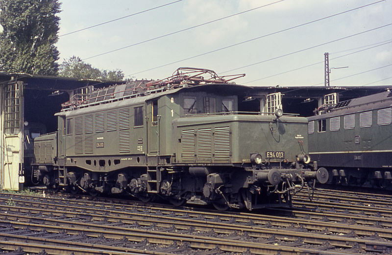 Das Betriebswerk Nürnberg Rbf. ist immer schon ein ganz wichtiges Bw für den schweren Güterdienst im fränkischen Raum gewesen. Im Bild zwei sechsachsige Loks, die der Bundesbahn in der aufstrebenden Republik nach dem Krieg bestimmt wertvolle Dienste geleistet haben. Die E 94 013 gehört zu der ersten Seire und stammt von 1940. Sie kam bei Ablieferung und Abnahme Ende 1940 zum Bw Pressig-Rothenkirchen. Die Reihe E 50 gehört zu den sog. Neubauloks der DB und wurde ab 1957 in Dienst gestellt. Obwohl wir uns im August 1968 bereits seit Monaten in der “Computer-Zeit” befinden (offziell äusserlich angeschriebene neue Nummern seit dem 1.1.1968), haben die Fahrzeuge noch die alten Beschriftungen mit den schönen Lokschildern - und die schweren Streckenelloks der DB sind allesamt noch grün! |