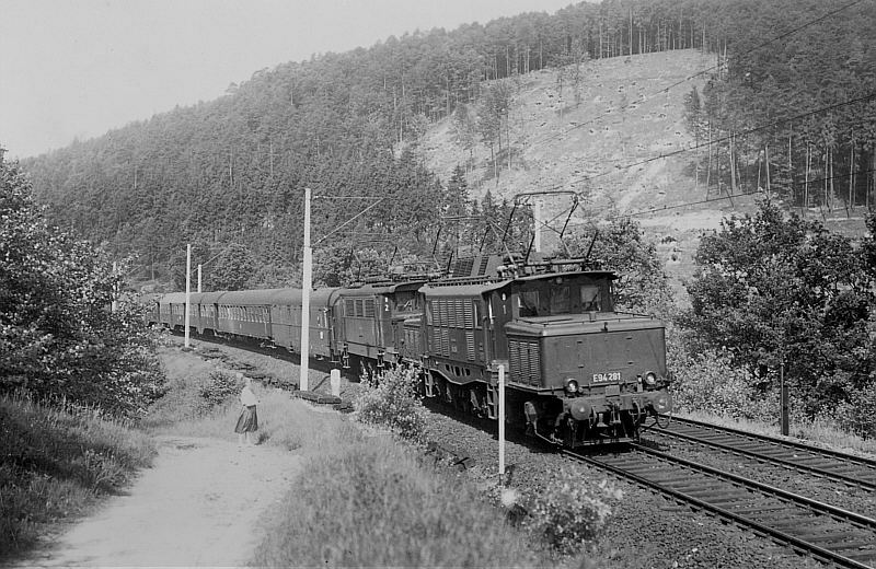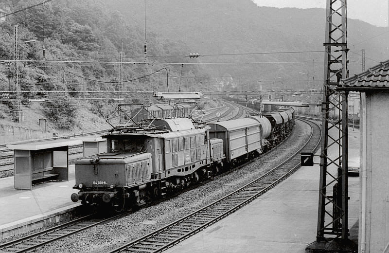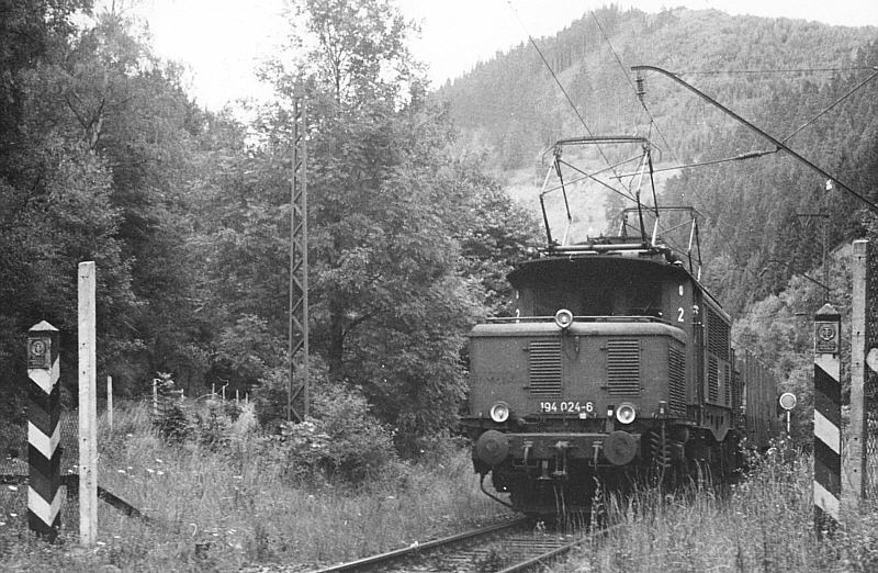 Für Eisenbahnfans eine interessante Szene mit höchst historischem Hintergrund. Wir befinden uns an der tristen “deutsch-deutschen Grenze” unweit vom Weiler Falkenstein an der alten Reichsbahntrasse zwischen Berlin und München. Streckenteile bis Leipzig der damals natürlich zweigleisigen Linie wurden noch während des Krieges weiter mit Fahrdraht überspannt. Nach der Teilung büsste die Strecke durch den Frankenwald schlagartig ihre Bedeutung ein. Teilabschnitte wurden anschliessend wieder auf ein Gleis zurückgebaut. Die Oberleitung blieb allerdings später bis zum Grenzbahnhof Probszella in der DDR bestehen, so dass bis dorthin weiter DB-Elloks fahren konnten. Am 23. Juli 1976 stehen wir im Gestrüpp an der Grenzmarkierung und bestaunen die 194 024-6 vom Bw Nürnberg Rbf., wie sie mit einem Güterzug von Probstzella hoch kommend langsam an uns am Anstieg der Frankenwaldrampe vorbeibrummt. Nach der politischen Wende ab 1989 gehörte die Frankenwaldbahn zu den bevorzugten “Verkehrsprojekten Deutsche Einheit”, und der Aufnahmestandort liegt nun wieder in der grünen Mitte Deutschlands. Aber ein Grünton fehlt leider nun, denn die E 94er rattern leider nicht mehr über die Trasse .... |