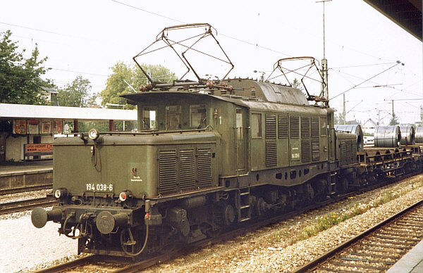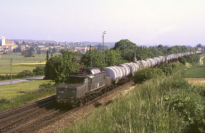 Wir stehen nicht weit weg vom Bahnhof Reichertshofen (Obb.) an der Strecke zwischen München und Ingolstadt, wo wohl unzählige E 94er, in den letzten Jahren viele mit Kesselwagen, hergefahren sind. In der Gegend um Ingolstadt haben sich verschiedene Raffinerien angesiedelt. So ein Ganzzug aus den schweren Waggons macht schon einen tollen Eindruck und ist ein ideales Vorbild für die Modellbahn (so man denn genügend Kleingeld im Sparstrumpf hat). Nur wenige Tage wird die 194 noch gebraucht, damals Grund genug, in den Wochen zuvor intensive Fototouren zu unternehmen (Gg 58387 am 24. Mai 1988). Die abgebildete 194 112-9 gehörte zusammen mit der Nr. 158 zu den beiden letzten planmässig eingesetzten DB-Krokodilen. Im November 1943 kam sie zuerst zum Bw Augsburg. |