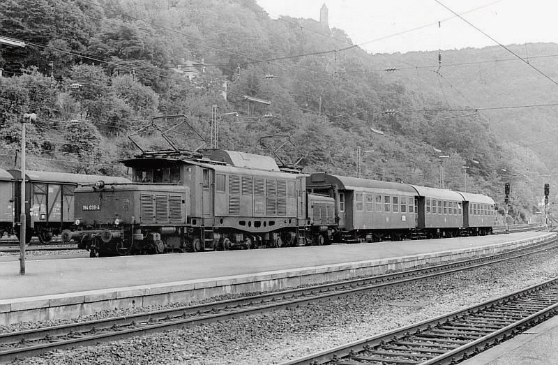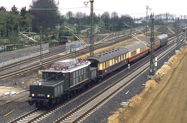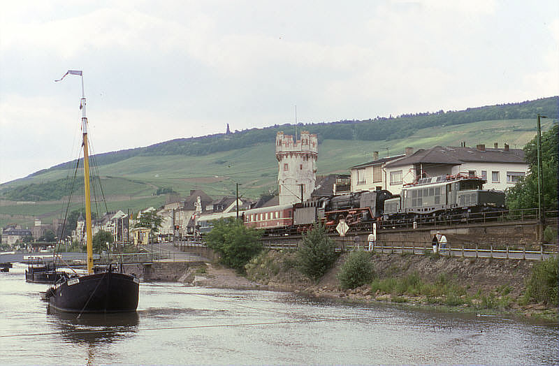 Anlässlich der Eröffnung des S-Bahn-Betriebes am 26./27. Mai 1990 fand in Köln eine Bahnausstellung statt. Dies war verbunden mit mehreren Sonderzügen. Aus Frankfurt war hierzu die 194 580 (Nachbau 1955) mit der 01 118 im Schlepp angereist. Die 01 wurde auf der Ausstellung gezeigt, während die E 94 zusammen mit einer 110er einen Sonderzug rund um Köln bespannen musste. Am Montag nach der Ausstellung fuhren die beiden Loks wieder in die Mainmetropole zurück. Bei der Durchfahrt durch Rüdesheim konnte dieses stimmungsvolle Motiv festgehalten werden. Denkt man sich die Ellok und die Oberleitung weg, so erinnert die Aufnahme sehr an verschiedene Bellingrodt-Fotos in dieser Gegend. |