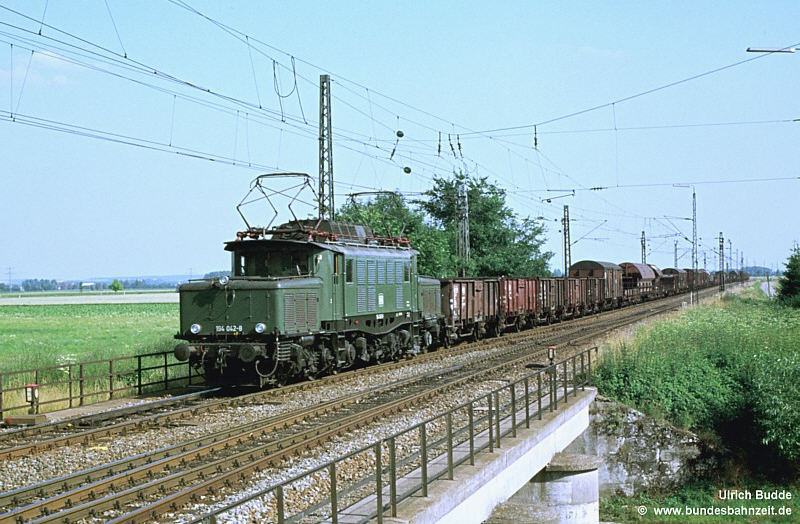 Südlich von Donauwörth liegt das Städtchen Mertingen an der Strecke nach Augsburg. Auf dieser Trasse fahren die schnellen Züge schon lange mit 200 km/h Höchstgeschwindigkeit. Die abgebildete 194 042-8 (Bj. 1942) bringt es nicht einmal auf die Hälfte des Tempos, ist aber für den Güterverkehr in den 70er Jahren noch immer eine wichtige Stütze für die Bundesbahn. Und in der flachen Lechau hat das Krokodil ohnehin keine Probleme, den Frachtenzug Dg 54374 pünktlich ans Ziel zu bringen. Bei schönstem Sommerwetter wartete der Fotograf am 12. Juli 1977 auf den Zug. |