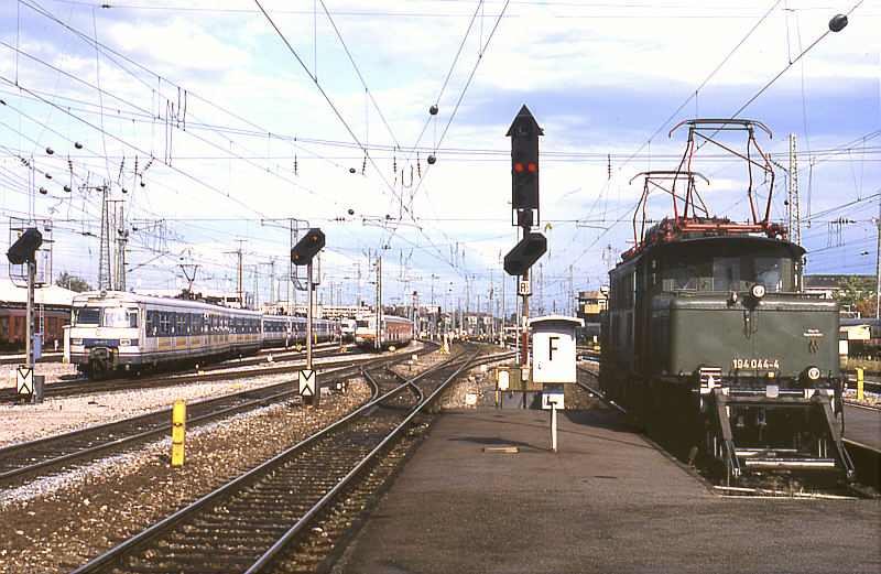Wir sind nicht nur in Altbayern, sondern auch im Alt-Stammgebiet der Baureihe E 94. Denn in München und Umgebung fuhren die Maschinen bereits von der ersten Serie anno 1940 an bis zur Ausmusterung Ende der 80er Jahre. Das Bw München Ost gehörte dabei zwar nicht zu den letzten Heimatbetriebswerken der Baureihe, war aber über lange Jahre hinweg ein Bw mit E 94er-Bestand. Eine verdiente Ruhepause gönnt sich am 13. Oktober 1983 die 194 044-4 im Münchner Ostbahnhof, während die “Olympiatriebwagen” der Reihe 420 voll im S-Bahneinsatz sind. Die Nr. 044 machte im Januar 1943 ihre Probefahrt und kam zunächst vom Bw Augsburg aus zum Einsatz. |