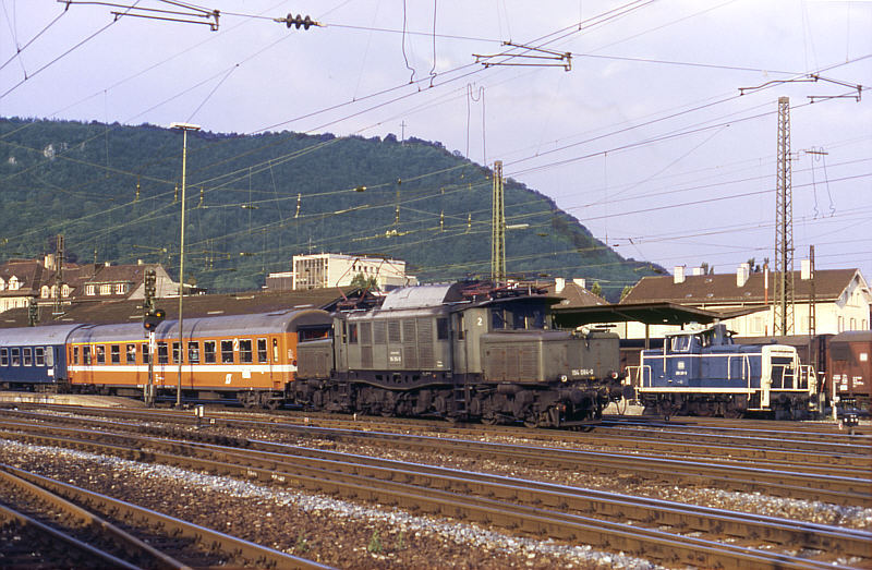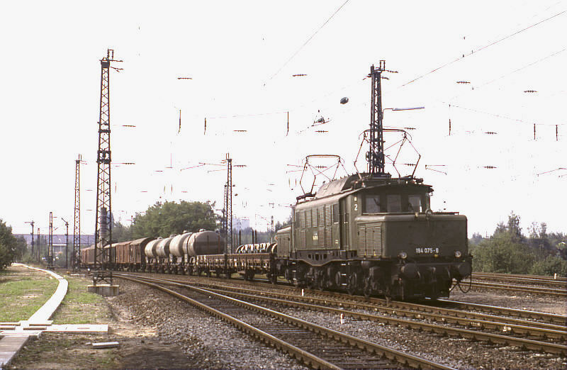 Der Nürnberger Raum ist immer eine klasische Hochburg für die E 94-Einsätze gewesen. Wir befinden uns hier im Bereich des Bahnhofes von Nürnberg-Langwasser. Die 194 075-8 (abgeliefert im November 1942) kommt uns mit einem langen Güterzug aus dem Rangierbahnhof entgegen. Kurze Zeit nach der Aufnahme vom 21. September 1985 wurde der Bahnhof Langwasser für die anstehenden Lokparaden zum 150jährigen Jubiläum der deutschen Eisenbahnen für den Durchgangsverkehr gesperrt. |
