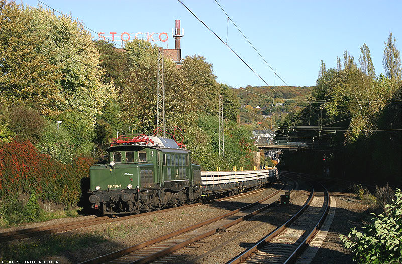 Der Planeinsatz der 194er ist bald zwei Jahrzehnte vorbei, aber dank der erhaltenen Museumsloks gibt es auch heute immer wieder Züge zu bespannen - und einige sogar im “Plandienst”. Im Bild die in Privatbesitz befindliche 194 158-8, die im Auftrag der Firma Eichholz einen Zug mit Neuschwellen von Misburg nach Igel durch den Bahnhof Wuppertal-Sonnborn zieht. Die E 94 ist ja hier nie planmässig gefahren, um so mehr nehmen wir das Motiv gerne mit ins Archiv (21.10.2004). |