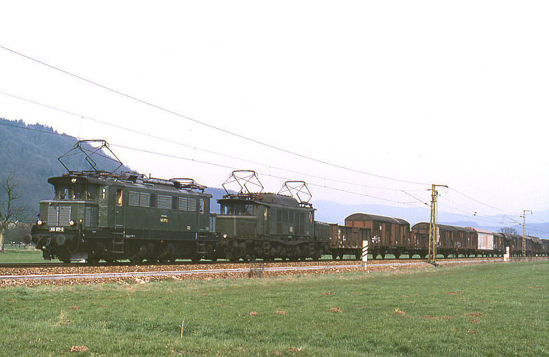 Die Linien an Wiese und Wehra, ganz im Süden von Baden nahe der schweizerischen Grenze gelegen, gehören zum Altbestand der elektrifizierten Strecken der deutschen Bahnen. Hier wurde schon früh ein kleines Netz aufgebaut, dass zunächst vielfach als Versuchsterrain galt. Erst in den 50er Jahren konnte das Netz an die von Norden vordringende Elektrifizierung der Bundesbahn angeschlossen werden. Im Bild eine interessante Zugkomposition mit der 145 177-2 und der 194 161-6 auf einem Abschnitt östlich Lörrach. Der gemischte Güterzug fährt von Schopfheim nach Weil am Rhein. Mit den Loks und den unterschiedlichen Waggons ein tolles Vorbild für die Modellbahn (7. April 1979)! Die E 94 161 gehört zur Serie der “Teile-Loks” und wurde im Sommer 1952 an die DB abgeliefert. |