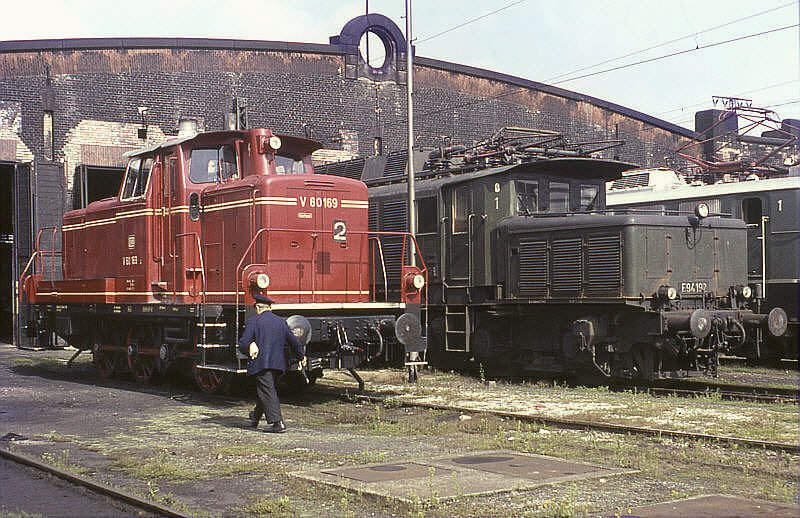 Zwei Güterzugloks, auf die man sich immer verlassen konnte. Die eine im Verschub, die andere im Streckendienst. Im August 1966 haben wir dem Bw Mannheim einen Besuch abgestattet und dieses Motiv festhalten könnnen. Vor dem neuen Einsatz gibt es erst einmal eine Ruhepause. Die V 60 169 ist offensichtlich als Nr. 2 im Rangierbahnhof eingeteilt, die E 94 192 wird wahrscheinlich demnächst einen Zug Richtung Stuttgart oder Basel ziehen müssen. Und die E 40 ganz rechts, die gehört natürlich auch zu den zuverlässigen Pferden im Stall der DB und scheint nach der sauberen Dachpartie recht neu zu sein. Der alte Schuppen hingegen hat bestimmt schon bessere Bahnzeiten durchlebt. Die E 94 192 ist ein Nachbau der Bundesbahn und ist beim Zeitpunkt der Aufnahme erst zehn Jahre alt und damit nur ein Jahr älter als die rote Diesel-Schwester. Die Nr. 192 kam nach Abnahme am 4.2.1956 zunächst beim Bw Heidelberg unter. |