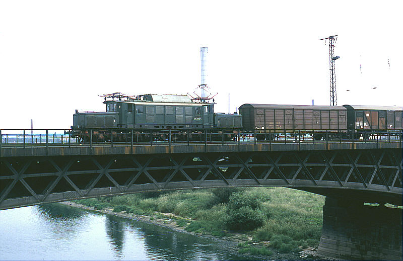Die im Osten Deutschlands verbliebenen E 94er bekamen bei der DR ein knallrotes Fahrwerk verpasst, woran man sich zunächst erst einmal gewöhnen musste. Schlecht sah die Sache nicht aus. Auf dem Bild ist diese Farbgebung bei diffusem Licht soeben zu erkennen. Wir sind nach Sachsen gefahren und können die 254 052-4 vom Bw Reichenbach auf der Elbbrücke in Dresden mit einem Güterzug bewundern (20. Juni 1981). Die Maschine kam Ende 1941 zunächst beim Bw Pressig-Rothenkirchen an der Frankenwaldrampe zum Einsatz. |