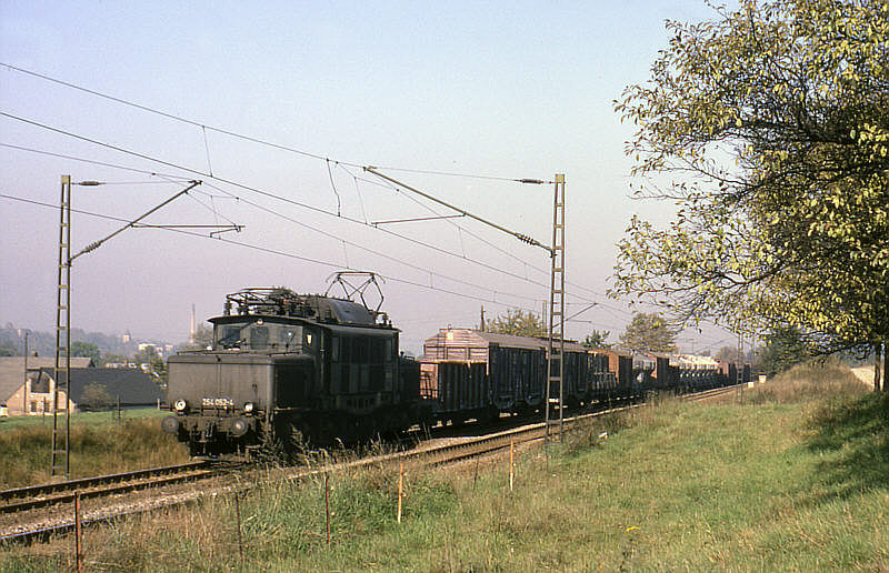 Ein schönes Motiv vom Einsatz der E 94 bei der Reichsbahn in der DDR. Auf Fotopirsch sind wir östlich von Glauchau und erkennen nochmals die 254 052 (Baujahr 1941) vor einem gemischten Güterzug. Man hält den 13. Oktober 1978 für die Archivdaten fest. Die rote Lackierung des Fahrwerks ist hier fast nicht auszumachen. |