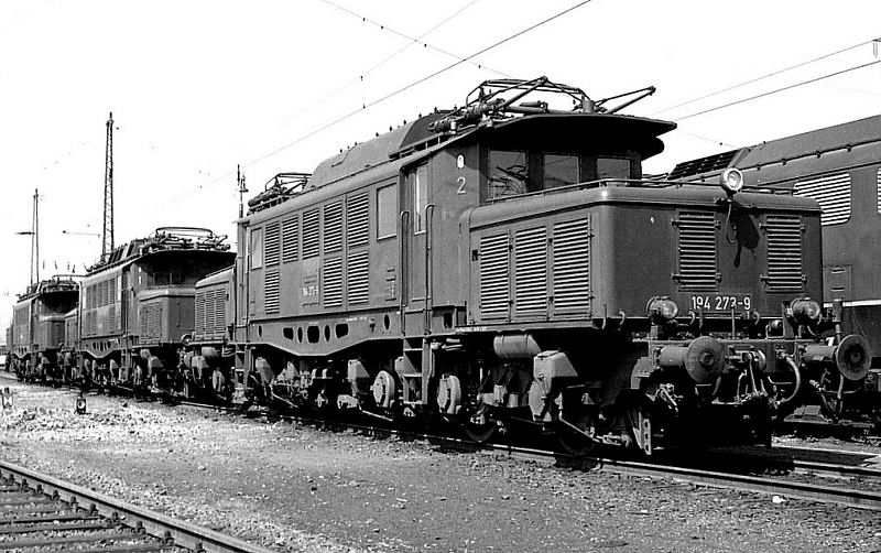 Krokodil-Meute in Westfalen - so könnte man die Aufnahme vielleicht benennen. Denn wir sind weit weg von den klassischen Einsatzgebieten der E 94, nämlich in Hagen, wo die Bahnfreunde zur Zeit der Aufnahme im Juni 1969 mehr den alten Dampfern der Baureihe 57.10 fröhnten und den Einsätzen der legendären 03.10er nachtrauerten. Über die Wetterautrasse von Hanau und über die Ruhr-Sieg-Strecke kamen vom Bw Aschaffenburg die Elloks planmässig mit einigen Güterzügen bis zum grossen Verschiebebahnhof von Hagen-Vorhalle. Dort standen sie dann einige Zeit abgestellt bis zur Heimreise nach Bayern. Bestaunen wir hier die 194 273-9 der Nachbauserie vom Sommer 1954 sowie zwei weitere Schwestern (und trauern diesen Alt-Ellok-Zeiten natürlich auch nach ...). |