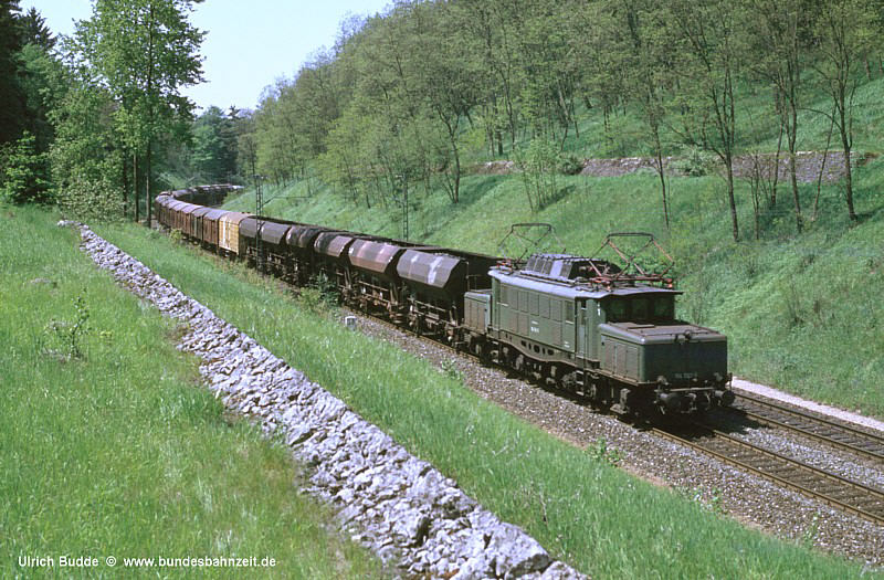 Ein Blick auf die Strecke beim Örtchen Endorf bei Laaber an der Linie zwischen Nürnberg und Regensburg. Es handelt sich um ein klassisches Aufmarschgebiet der Baureihe E 94 nach dem Krieg. Im Bild die 194 562-5, die allerdings zur Serie der Nachbauloks bei der DB gehört. Sie wurde als E 94 262 im Sommer 1956 beim Bw Nürnberg Rbf. immatrikuliert. Infolge der etwas höheren Leistung gegenüber vielen anderen Maschinen und 100 km/h Höchstgeschwindigkeit wurde sie später als 194.5 eingereiht (1. Juni 1978). |