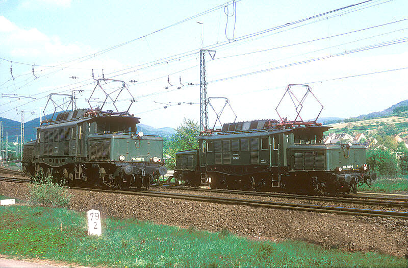 Der Spessart ist zwar kein besonders hohes Mittelgebirge, fällt aber im Westen zum Rhein-Main-Gebiet hin doch stärker ab. Diese Situation war schon für Bahnbauer in alten Zeiten ein grosses Problem, so dass man den Höhenunterschied nur mittels einer Steilrampe zwischen Laufach und Heigenbrücken bewältigen konnte. Dieser Zustand hat sich bis heute nicht geändert, so dass viele Güterzüge auch in neuerer Zeit noch nachgeschoben werden müssen. Das war natürlich auch für die E 94 ein “dankbares” Einsatzgebiet. Hier sehen wir am Fuss der Ranmpe in Laufach gleich zwei der beliebten Krokodile, die 194 581-5 und 194 583-1. Das Foto stammt vom 18. April 1981. Bei beiden Maschinen handelt es sich um Nachbauloks von 1956, ab 1970 als Reihe 194.5 für 100 km/h zugelassen. |