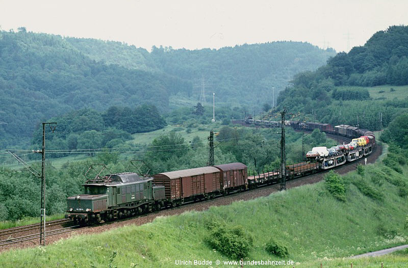 Ein weiteres Bild vom Spessart-Schubdienst. Verschiedene Projekte einer Neutrassierung mittels eines Basistunnels sind bisher gescheitert, obwohl es sich beim betreffenden Abschnitt um eine relativ kurze Trasse handelt. Seit der Elektrifizierung der Strecke Ende der 50er Jahre wurde die E 94 gleich für derartige Dienste engagiert. Eine solche Situation sehen wir im Bild. Der Dg 53105, selbst von einer E 94 geführt, bekommt die ersehnte Unterstützung von der 194 585-6 (letzte Nachbaulok der DB vom Sommer 1956). Die Masten für den notwendigen Zugfunk sind dabei unübersehbar. Der Aufnahmestandort ist den Insidern bestimmt bekannt und liegt unweit der Ortschaft Hain. Man ist am 5. Juni 1980 auf grosser Fototour. |